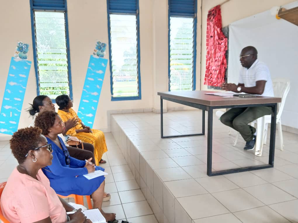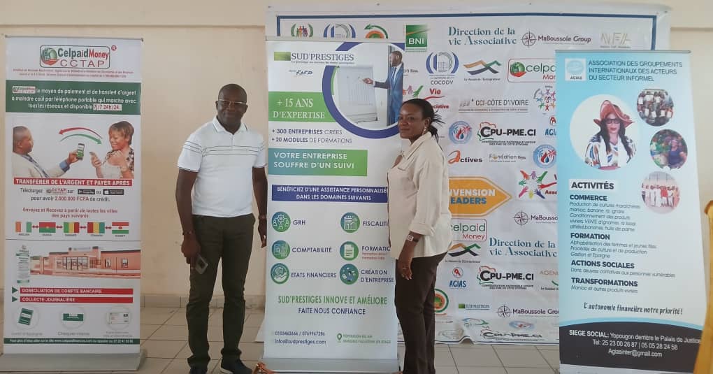 Séance d’information et d’échange lors d’une formation en entrepreneuriat organisée par l’association AGIAS à Abidjan. Des femmes engagées écoutent attentivement les conseils d’un formateur, prêtes à développer leurs projets et à renforcer leur autonomie économique.