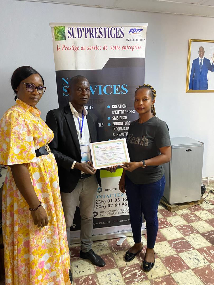 Séance d’information et d’échange lors d’une formation en entrepreneuriat organisée par l’association AGIAS à Abidjan. Des femmes…